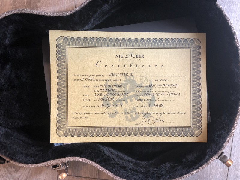 Nessguitar Custom Méga utilisateur #1 Publié par Nessguitar le 29 Juin 2021, 09:41 Vends cette superbe Nik Huber Krautster 2 couleur Worn Onyx Black Guitare exceptionnelle en tous points, lutherie de très haut vol, manche érable flammée. Les spécifications sont sur le certificat en image jointe. Elle est de 2017. Vendue avec son hard case. PRIX : 2 200 € nhk3 nhk4 ---------------- Prix de vente : 2200 euros ----------------