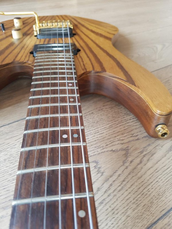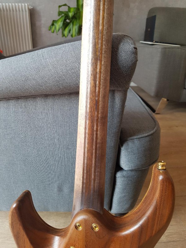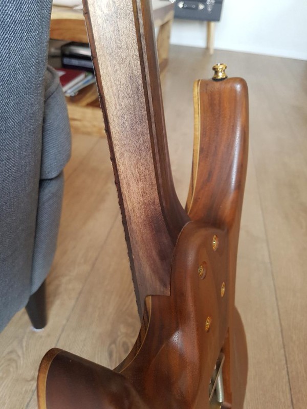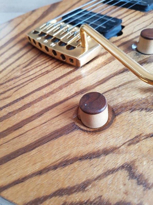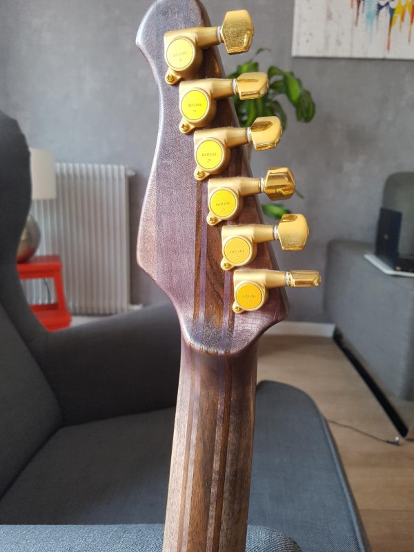 Accastillage GOLD mécaniques gotoh magnum et électronique très haut de gamme, boutons Volume et Tone en bois. Action basse et cordage en 10-46 ernie ball M steel.