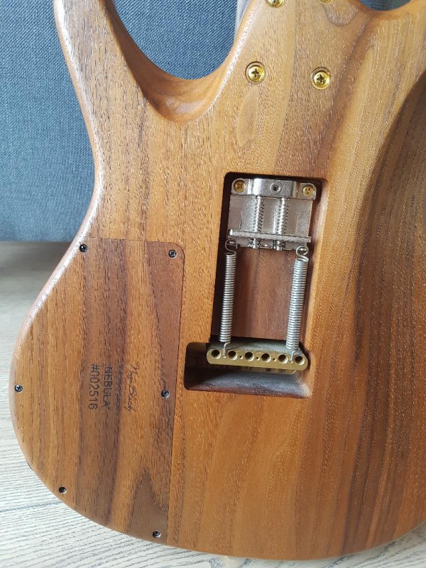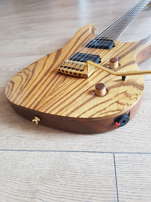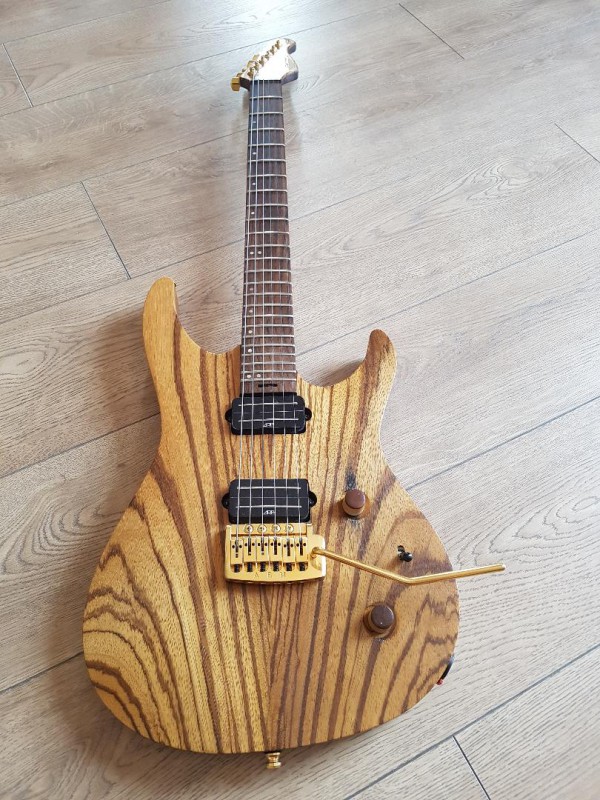 Cette guitare est très polyvalente aussi bien pour les sons clair que saturés ou elle excelle par ailleurs. Très résonnante à vide de par la qualité des bois : Noyer américain (corps) + table en Zebrano. Erable et Wengé (7 couches) au manche, tête en Zebrano comme le placage du corps. le manche est large et fin, une autoroute !
