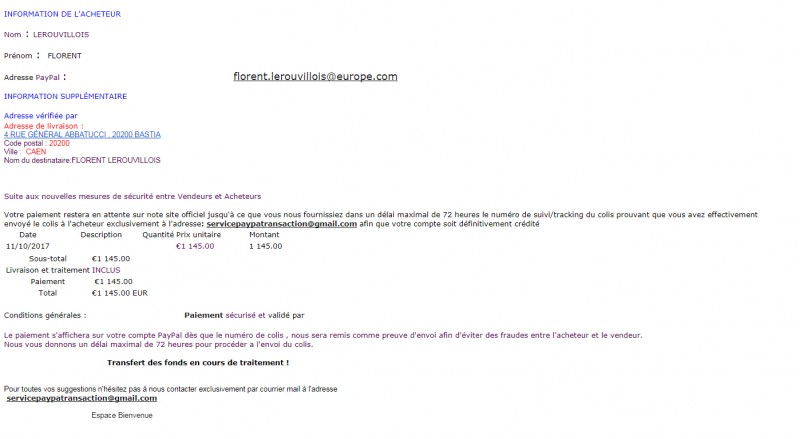servicepaypatransaction@gmail.com) stipulant que vous devez préciser un numéro de colis/de suivi pour que l'argent soit sur votre compte dans les 72h.