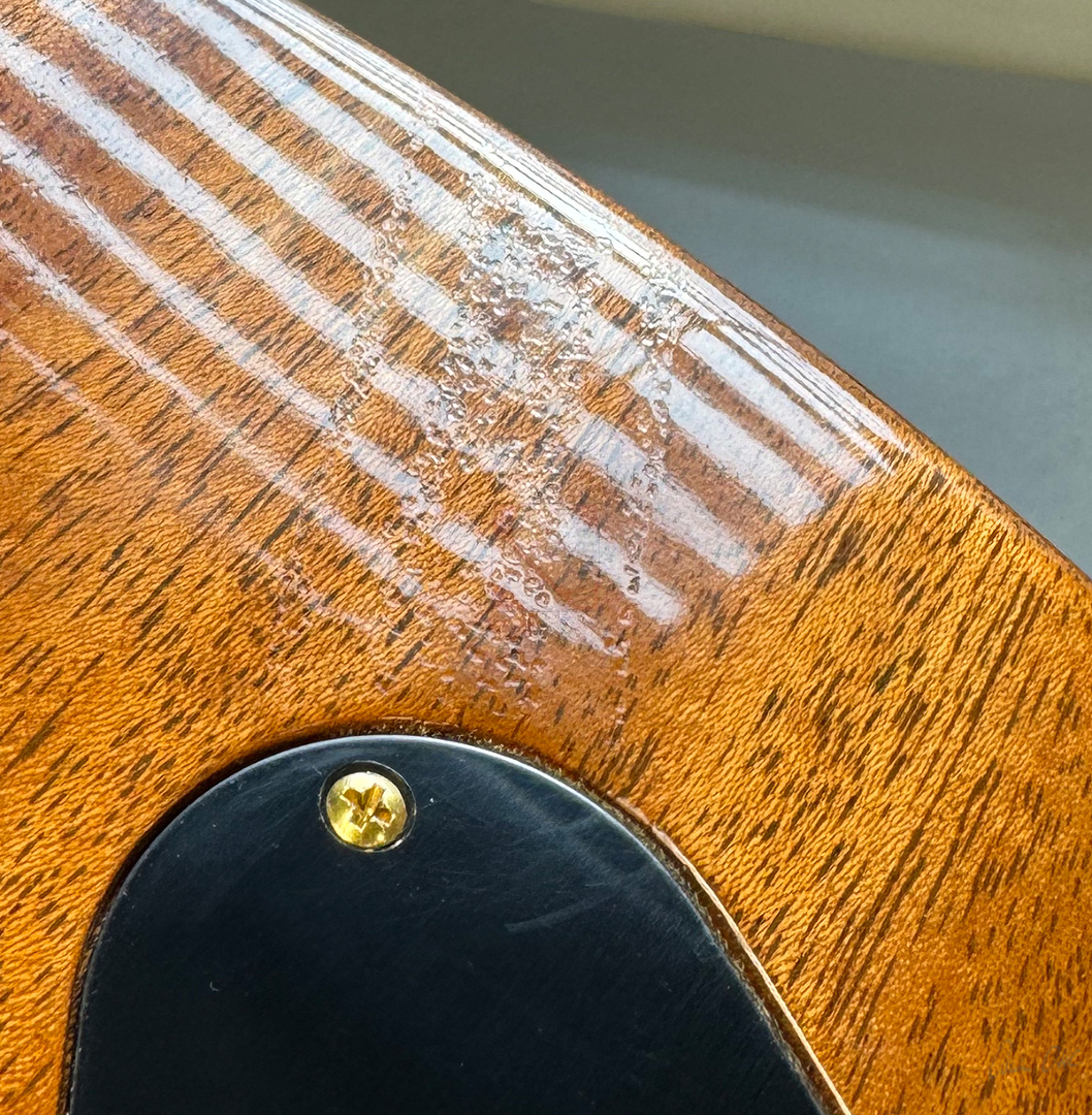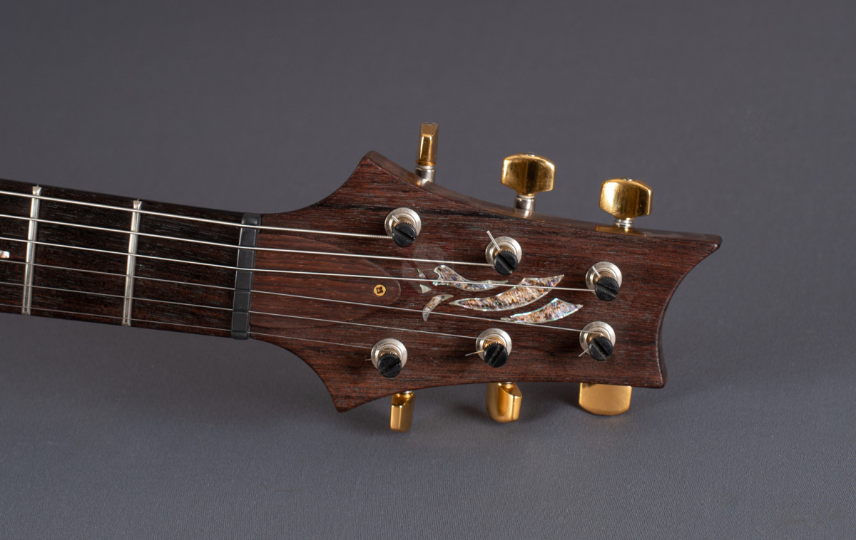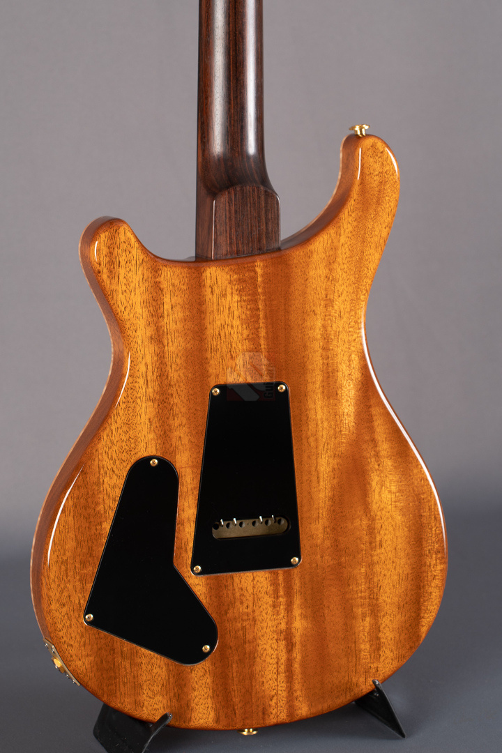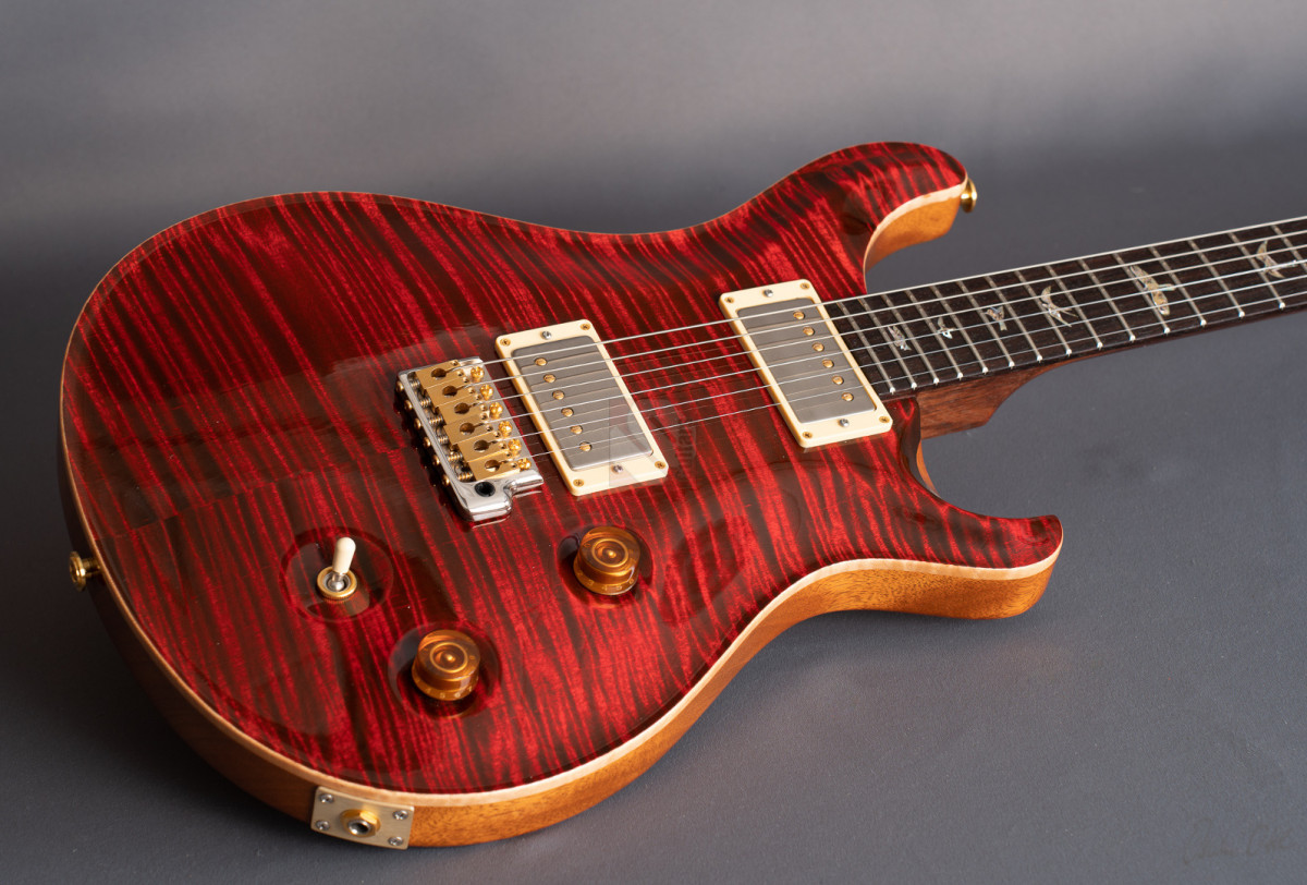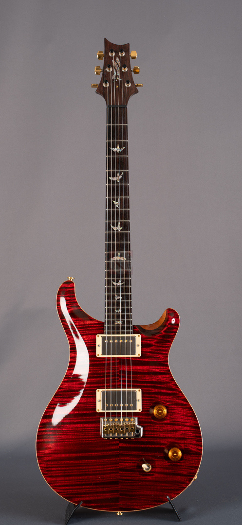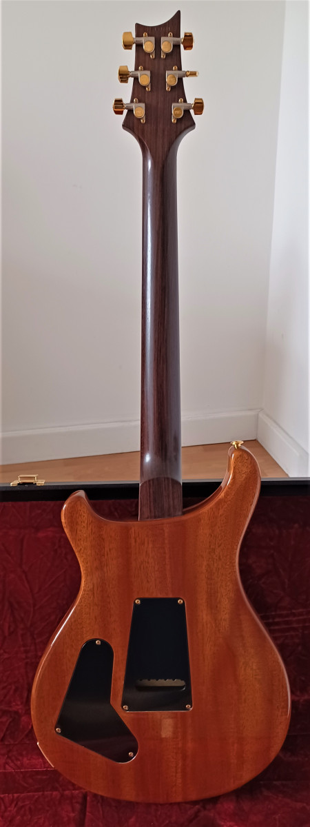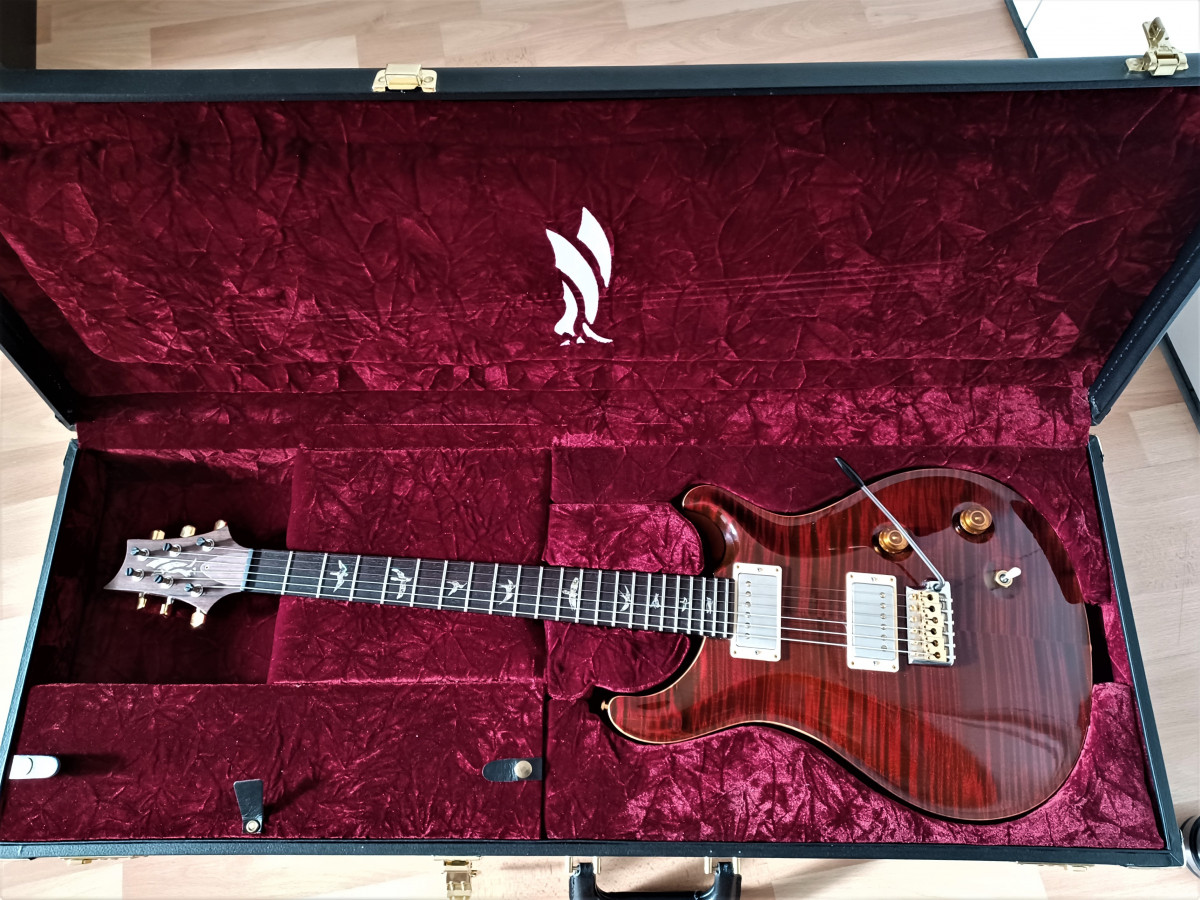PRS Modern Eagle II Red Tiger de 2008. Entièrement d'origine. En très bon état (seuls quelques traces sur le vernis au niveau des attache courroies faites par le précédent propriétaire). Corps en acajou, table en érable ondé "Artist Grade", manche et touche en palissandre indien, profil du manche Wide Fat, micros MEII (première version des 57/08 ), 1 volume, 1 tonalité avec Push-Pull, accastillage "hybrid". Vendue dans son étui d'origine. Poids : 3,78 kg.