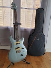 Je vends donc une PRS SE toute récente et fraichement réglée par Guitare Garage à Pigalle (pour 70 euros, réglage complet avec cordes neuves).