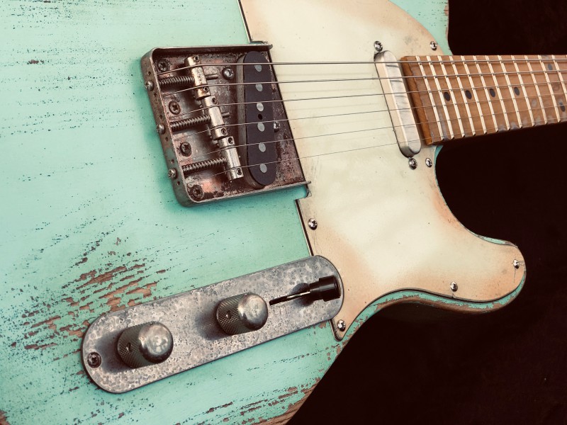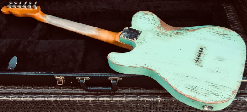 Superbe et unique Custom Shop Telecaster avec un corps en Swamp Ash (frêne des marais) faits en Angleterre par luthier Heavily-Reliced en finition Surf Green avec un manche entièrement en érable, tous les deux fini et Aged en 100% Nitrocellulose.Micros réellement bobinés-main (2h de bobinage par micro) « Classic Blues Tele", Vintage Reissue avec des aimants Alnico V.Accastillage Gotoh Japan, haut de gamme. Electronique cablé à la main avec un selecteur 4-positions, potards CTS & condensateur PIO vintage.