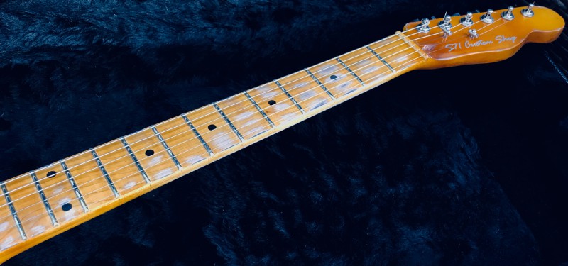 - All Maple neck with a standard Fender « Modern C » profil, Radius 9.5, medium/jumbo 22 frets, aged in full amber nitro. A very great satin feel on the neck due to the very thin nitro finish.