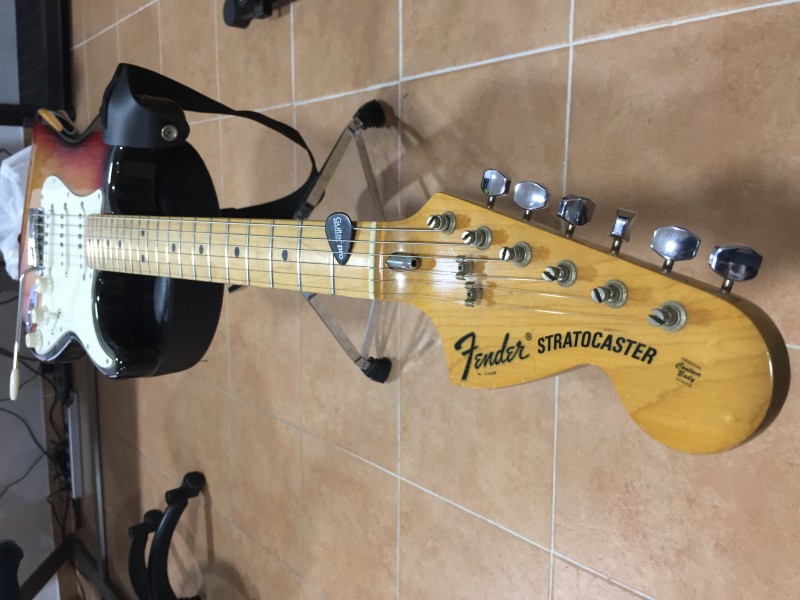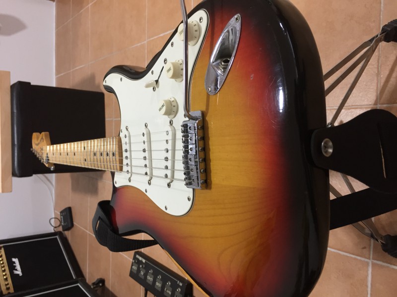 Bonjour à tous, je vends une Stratocaster 73', de couleur Sunburst, 100% d'origine, étui d'époque.