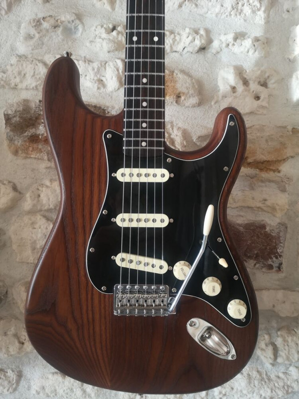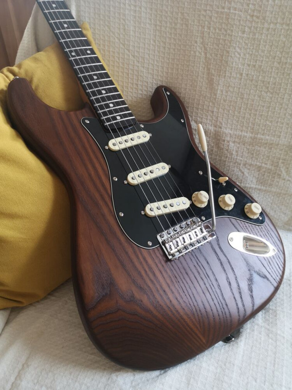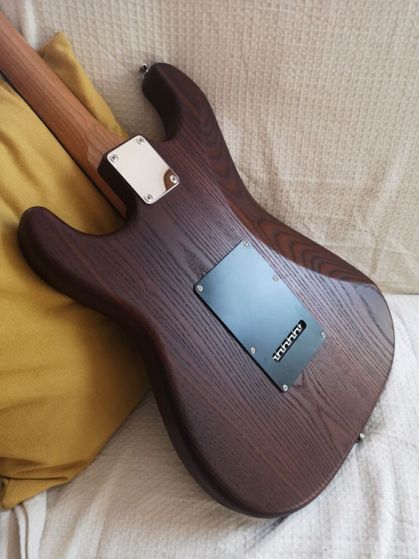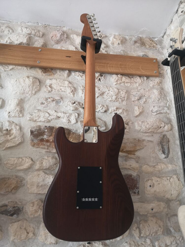 Donc un corps Hosco made in Japan en Frêne des marais, "rôti", vernis nitro open pore et peinture graphite dans les cavités.
