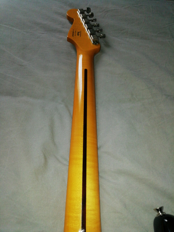 Corps en Aulne en deux parties, manche erable flammé, frettes à 100%, réglée pile poil…