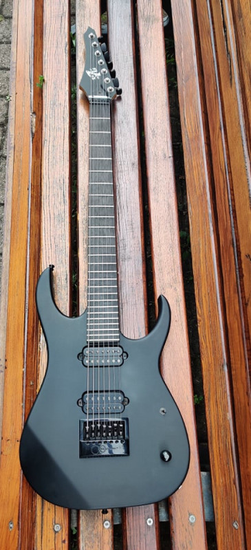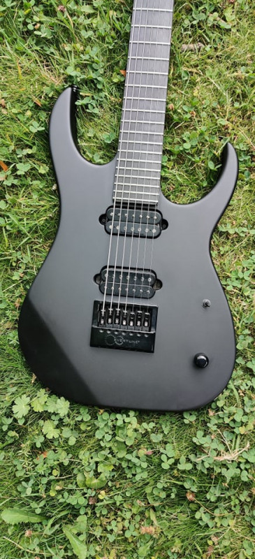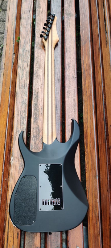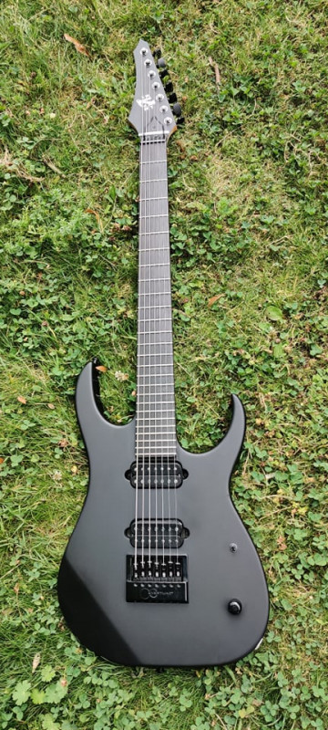 Corps en frêne du Nord, manche en érable flammé/noyer, touche en ébène, 26 frettes en acier inoxydable, points latéraux illuminay, diapason 27'5 pouces, Pegasus/sentient, 1 volume avec push-pull, evertune.