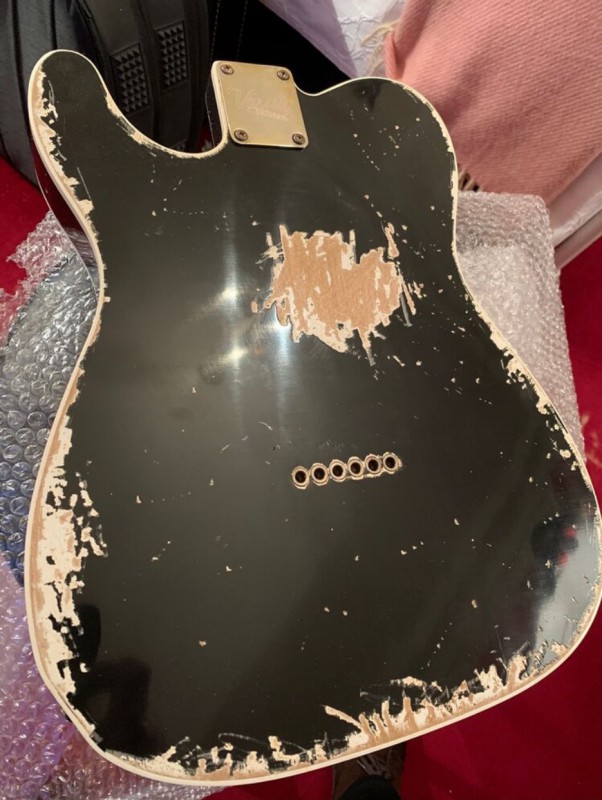 L’accastillage vieilli est fourni par Varsity Guitars Oklahoma: chevalet, pontets, vis, prise jack ont eu un traitement spécifique, ainsi que le pickguard, les attaches-courroie, la plaque et les boutons.