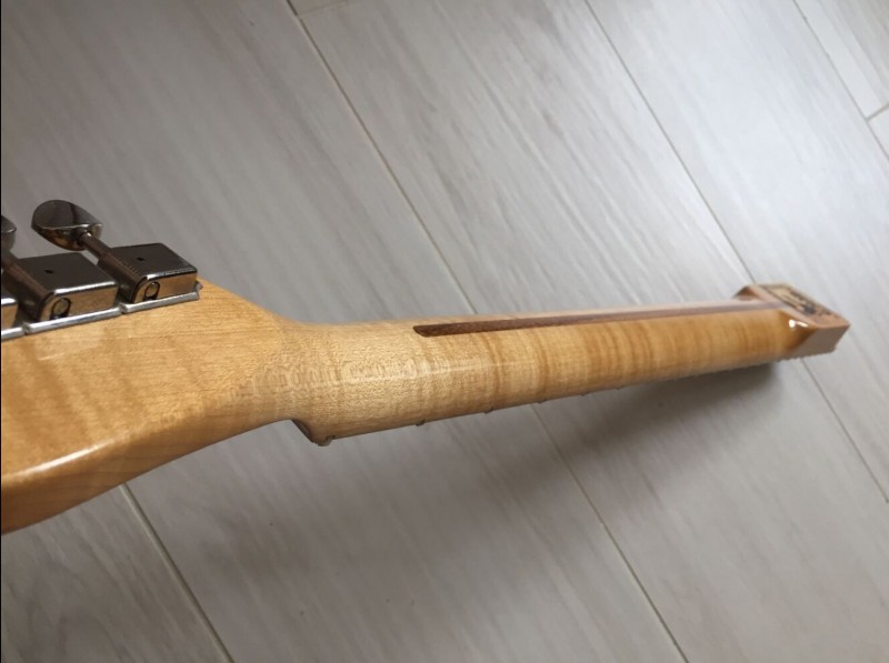 Manche profil ’59 en érable flammé une pièce, mécaniques vintage type Kluson, frettes medium jumbo nickel/argent 6150, sillet en os.