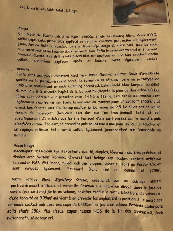 Achetée ici-même, faite par un luthier amateur, je vous laisse découvrir les specs sur la dernière photo.