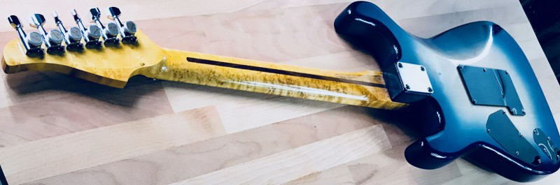 - Selected Alder two pieces body made by luthier, Caribbean Blue Burst nitro finish w high gloss bi-composant P.U. lacquer.
