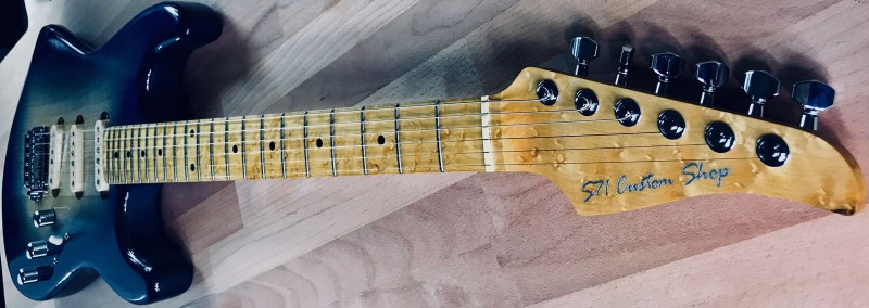 Made in USA S71 Custom Shop Prototype modern Stratocaster Caribbean Blue Burst, magnifique manche de luthier Birdseye Duckbeak en érable fabriqué aux États-Unis. Corps en aulne sélectionné, micros ’Bobinés-main’ simple-bobinage «Hot Custom», Tremolo à 2 points Gotoh Japan, mécaniques Gotoh Magnum Lock, électronique cablé-main avec condensateur PIO.