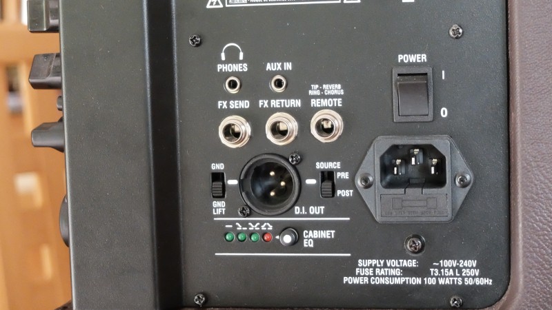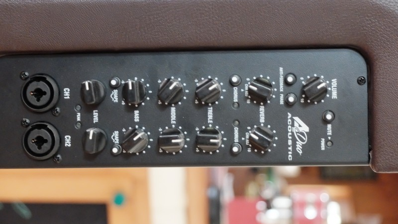 Contrôles: Level, Bass, Mid, Treb, Shape, Chorus, Reverb, Anti-Feedback, Phase
