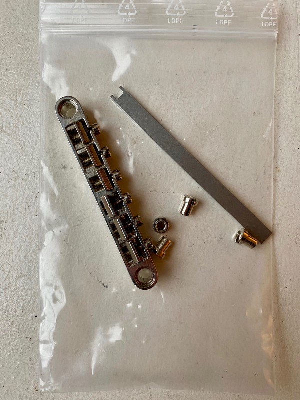 Ce chevalet en pure alliage d’aluminium a la particularité de pouvoir être vissé aux inserts de la guitare. Ce design empêche le chevalet de tomber et augmente le sustain. Il est ici dans la version chromée.