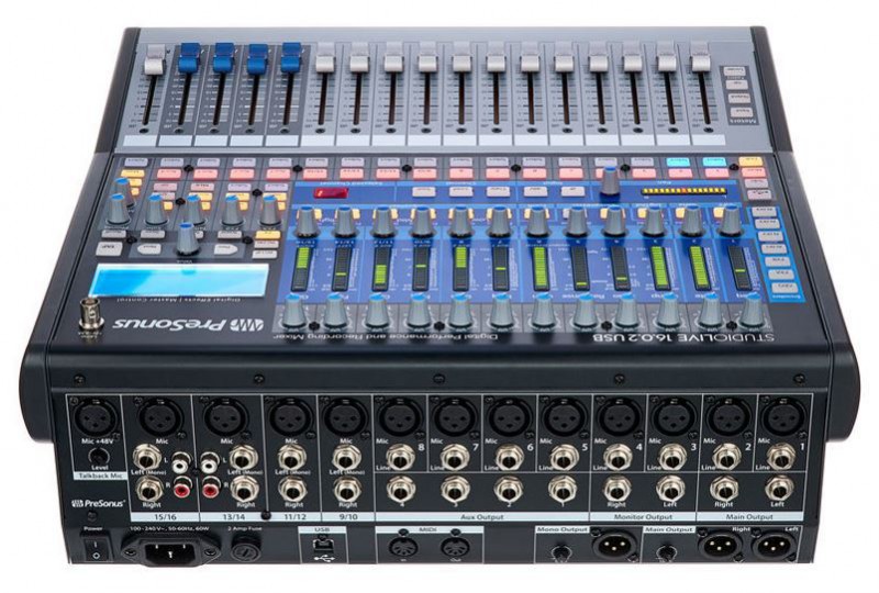 Sorties: 3x XLR (sommation mono, L / R), 8x jack TRS (sommation L / R, moniteur L / R 4x Aux)