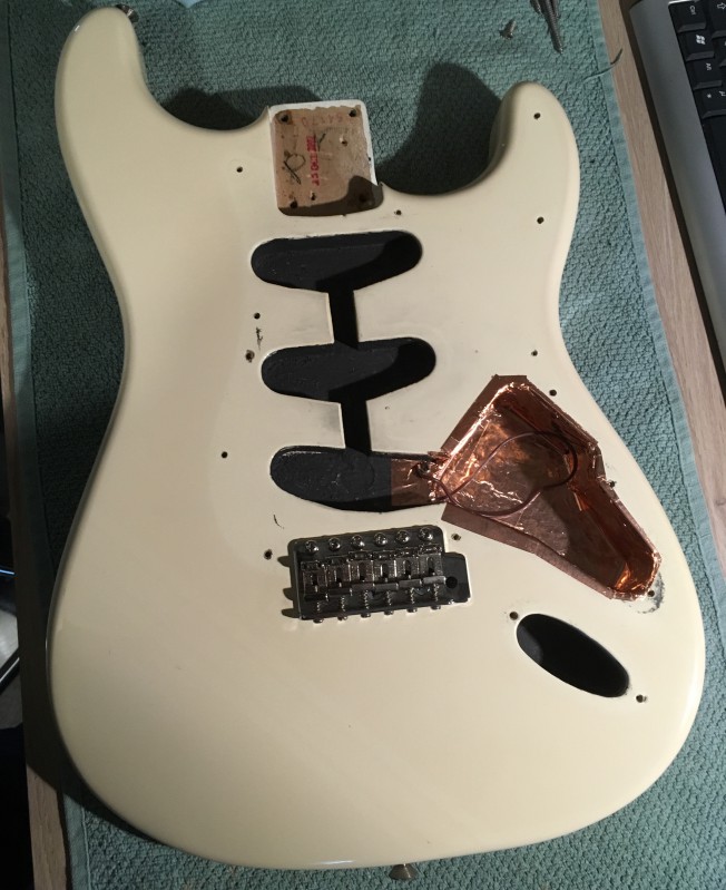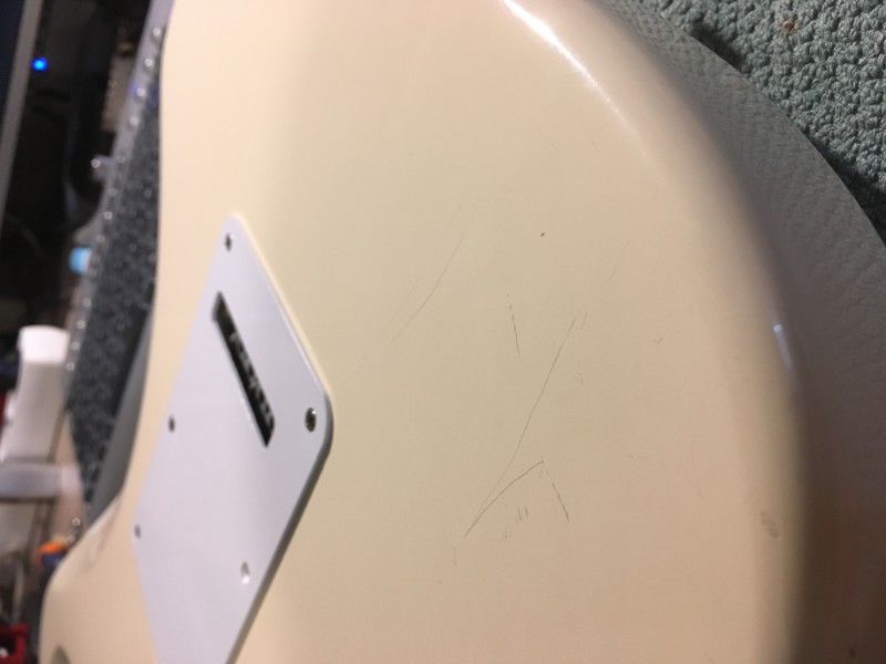 Corps de Stratocaster aux cotes fender couleur Olympic white de 2002. Il a accueilli des manches fender mex sans souci !