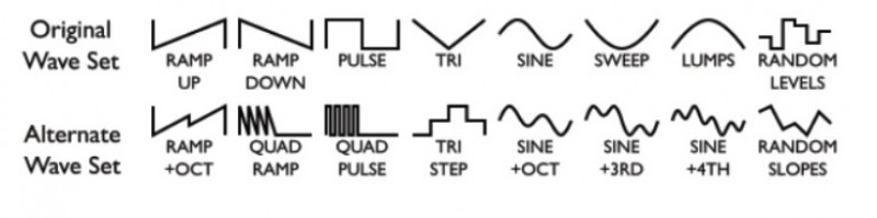 - Réglage de la "forme" du tremolo (tremolo sinusoidal "classique" bien sûr, mais ..11 autres formes de signal possibles aussi, dont des trucs assez spatio-temporels). L'éclairage de la LED de droite varie comme la forme du signal choisi !
