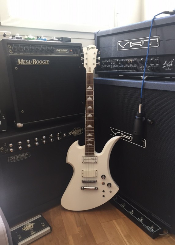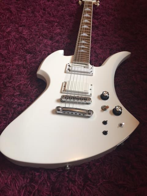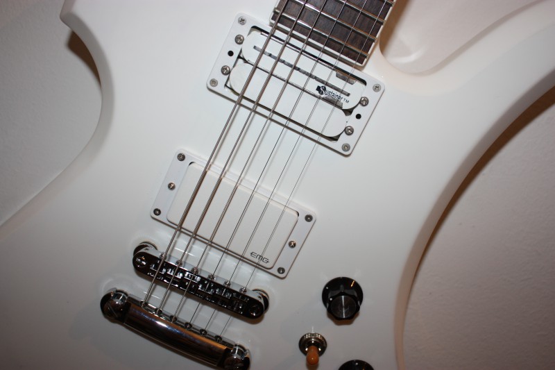 - Équipée d’origine du fameux sustainer401. C’est donc le modèle deluxe à 3 options (normal, harmonic, mix) et non pas le cheap 101 à deux options que l’on voit sur toutes les Ravelle, Revolver et Vertigo. Petit plus: c’est un sustainer blanc (ne se vend pas dans le commerce; uniquement créé pour hide et Vai). En chevalet on a un EMG81 blanc.