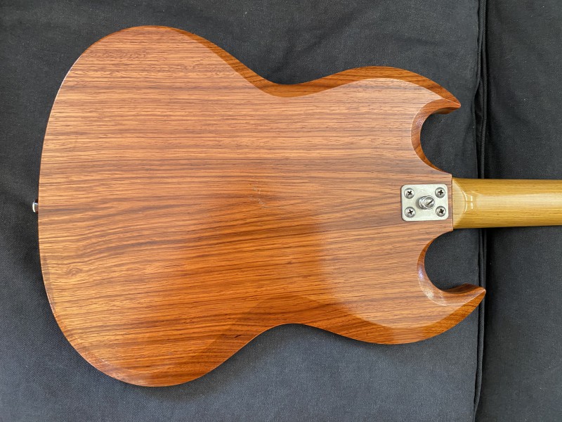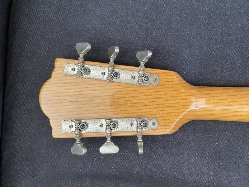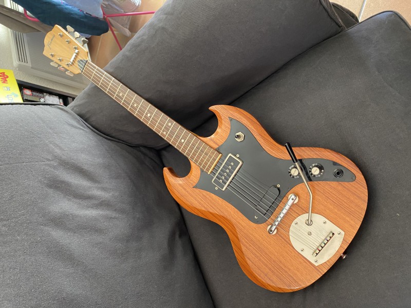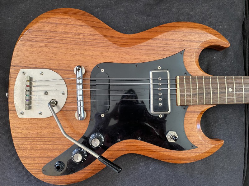 Elle est particulière puisqu’on retrouve un micro type P-90 en manche (Micro Bill Lawrence si je dis pas de bêtise mais pas sûr) et un micro qui rappelle les Fender Bronco ou Mustang en chevalet. Ainsi qu’un vibrato qui ressemble à ceux des Jazzmasters, il est ultra efficace et garde la guitare accordé.