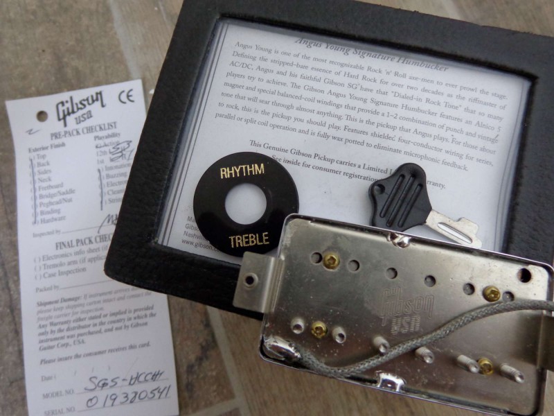 A noter que j’ai remplacé le micro chevalet par un micro Gibson Angus Young Signature. Je fourni le micro d’origine pour le remettre au besoin. Le micro Angus Young n’est plus vendu aujourd’hui est valait autour de 130€.