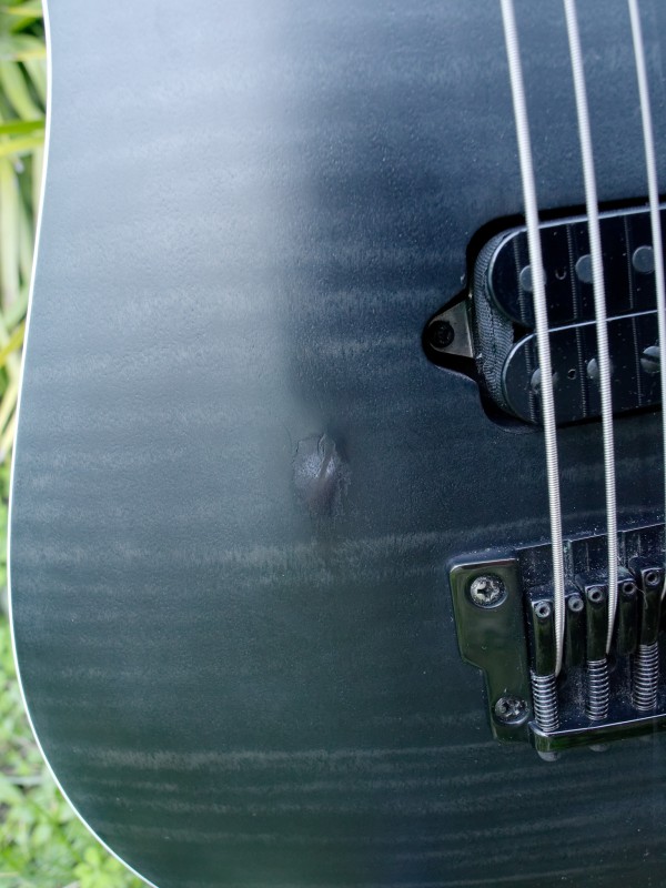 Elle a un seul défaut, une petite usure visible à gauche du micro chevalet ou repose la paume de la main (la petite tache claire sur la photo) et de la patine sur la droite du micro bridge.