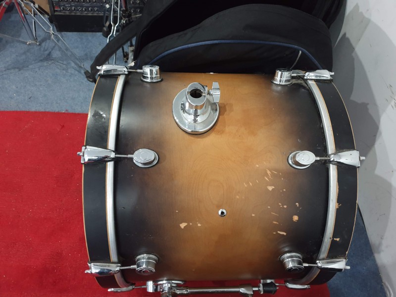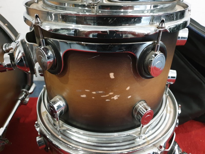 La batterie est en bon état structurel, mais témoigne de pas mal de traces de jeu dues à son utilisation au cours de concerts et tournées. Elle est fournies avec un ensemble de housses de marque Tobago et TKL.