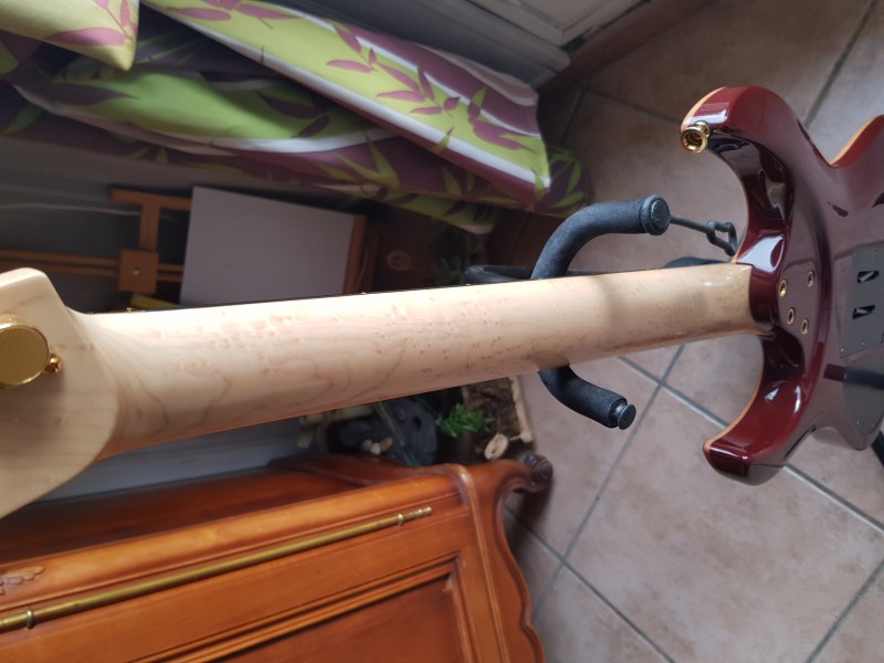 Manche birdseye 24 cases touche ébène, accastillage doré, strapslocks, dimarzio dp200 en chevalet.