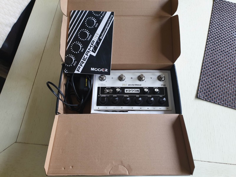 Je fournis le Mooer Preamp Live avec son transfo, sa boite d’origine, et son manuel (en allemand, désolé). Le manuel en français se trouve en ligne, mais avec l’application, c’est presque superflu.
