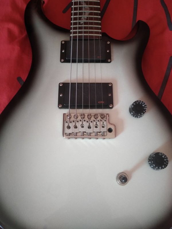 corps et manche en acajou, table érable, touche palissandre avec repères chauve-souris. Micros EMG splitables