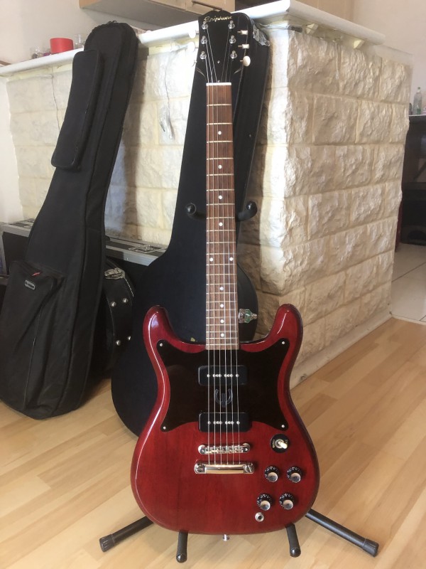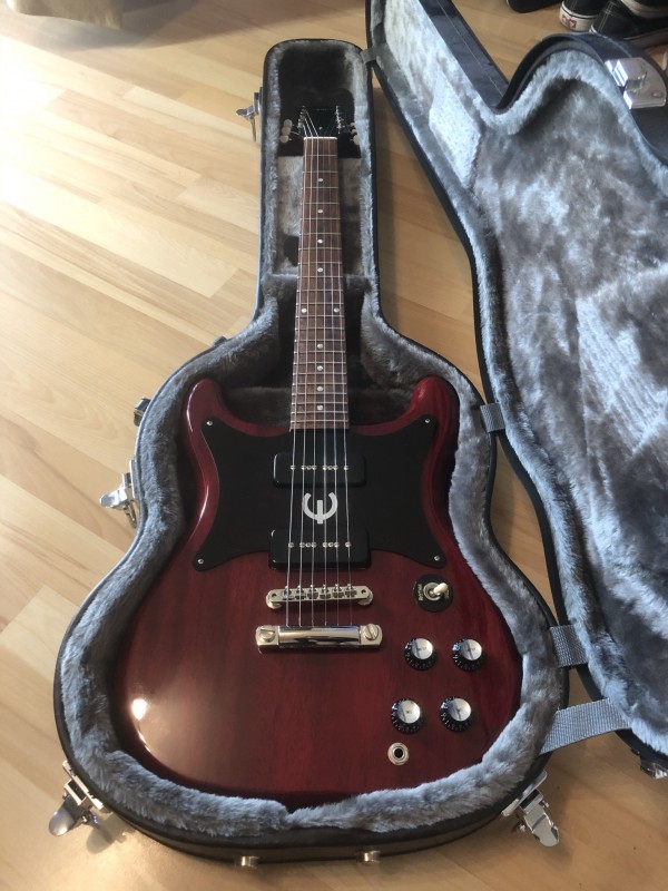 Je me sépare à contre cœur de mon Epiphone 1962 Wilshire Reissue de couleur Cherry, fabriquée à 100 exemplaires en 2009 par le Gibson Custom Shop aux Etats-Unis.