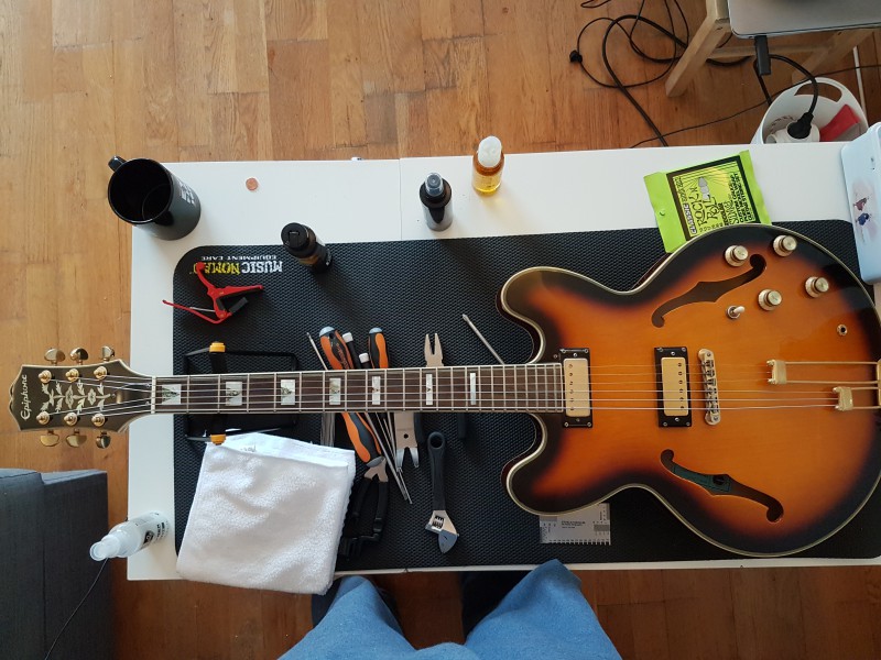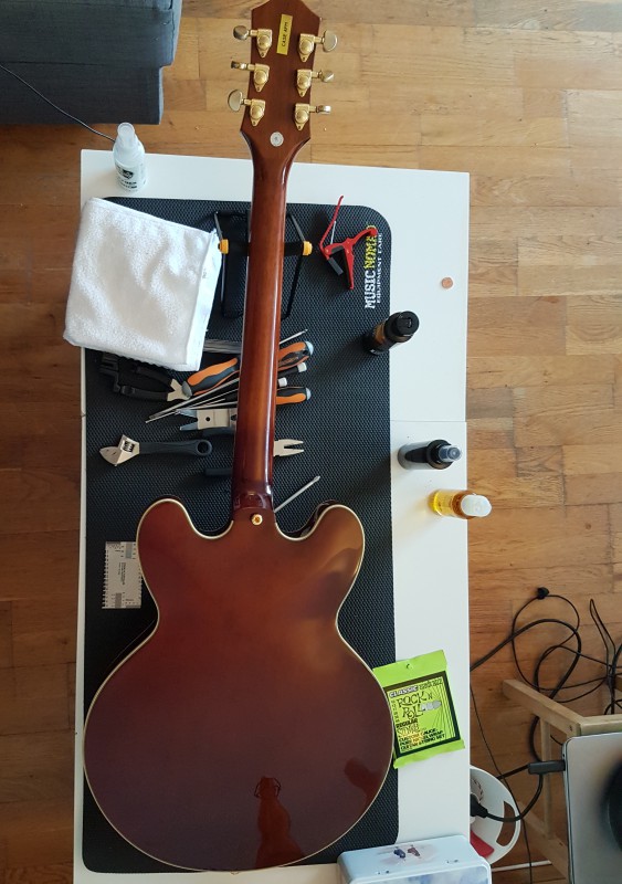 Disclaimer : Cette guitare est en état ’player’, elle a beaucoup été utilisée en groupe. Elle en porte les traces : les dorures ont un peu patiné, il y a des traces de frottement au dos, ainsi que 2 petits pocs à l’arrière du manche qui ne se sentent pas en jeu.
