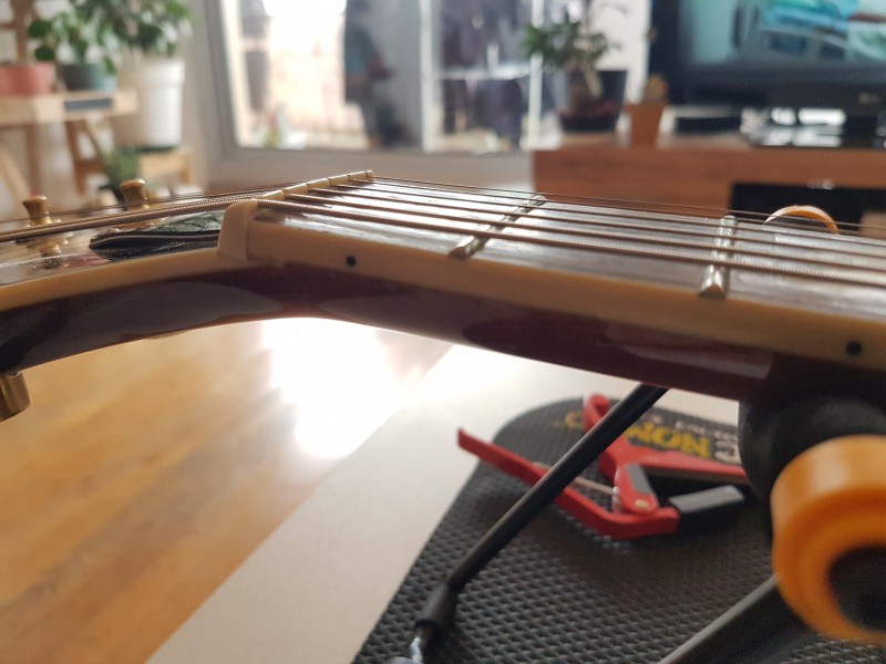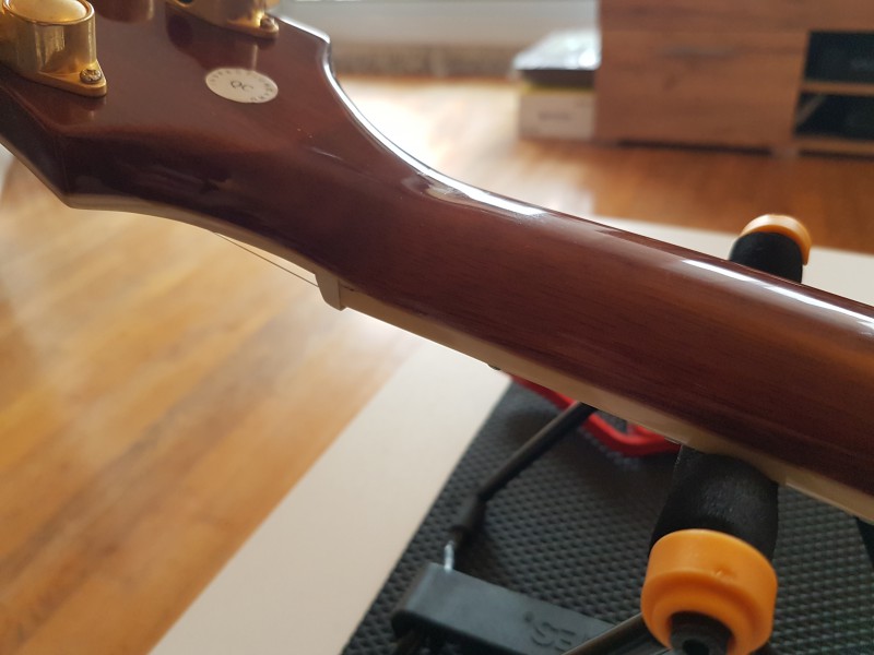 Par ailleurs, le vernis a des craquelures au niveau du sillet. Je l’ai récupérée comme celà en seconde main. Elle n’a jamais bougée depuis (je l’ai achetée en 2014). C’est à savoir et à surveiller. C’est aussi pour cela que je la met en vente en dessous de l’argus actuel (environ 800€, je doute que cette guitare parte réellement pour 1000€ comme ont peut parfois le voir sur les annonces).
