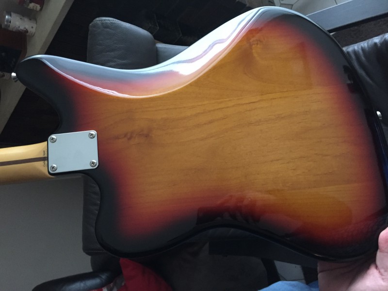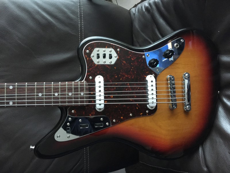 Je vends cette Jaguar CIJ en 2005 (de mémoire). Cette guitare provient d’une série limitée dont la particularité est qu’elle reprend les caractéristiques de la Bass VI (tirants, micros) tout en se rapprochant du diapason de la Jaguar (28,5 au lieu de 30 pour la VI).