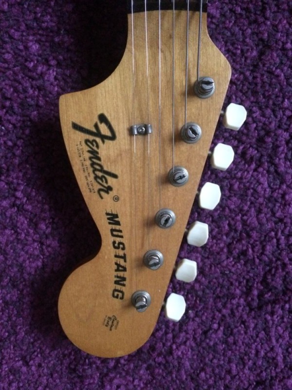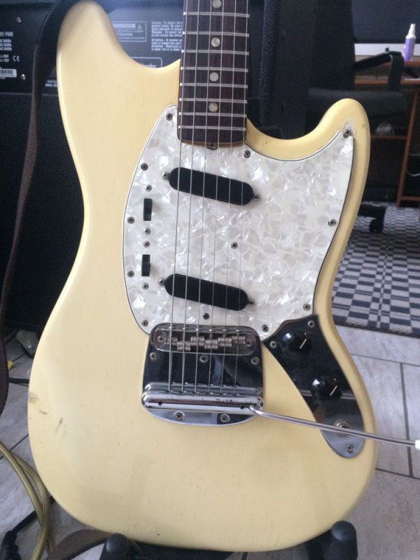 La guitare a été refrettée par un luthier et le sillet a été changé. C’est donc une Mustang parfaitement jouable et bien réglée. La meilleure que j’ai eu (j’en ai eu 4)