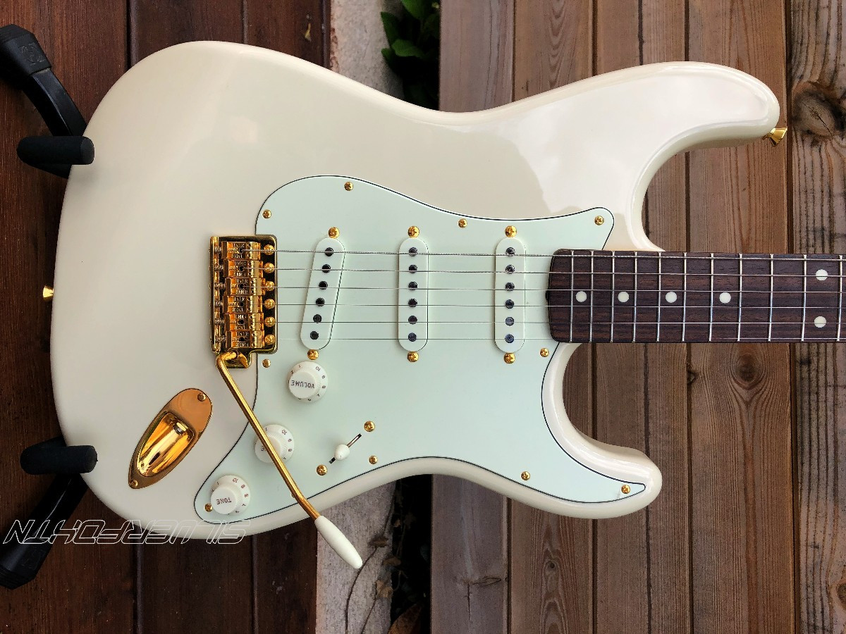 Totalement neuve, achetée en mag (Troc’n Roll Eguilles Fender Custom Shop revendeur agréé), toute d’origine, protection toujours présente sur le pickguard, livrée avec son bras vibrato, facture, gigbag Fender d’origine.