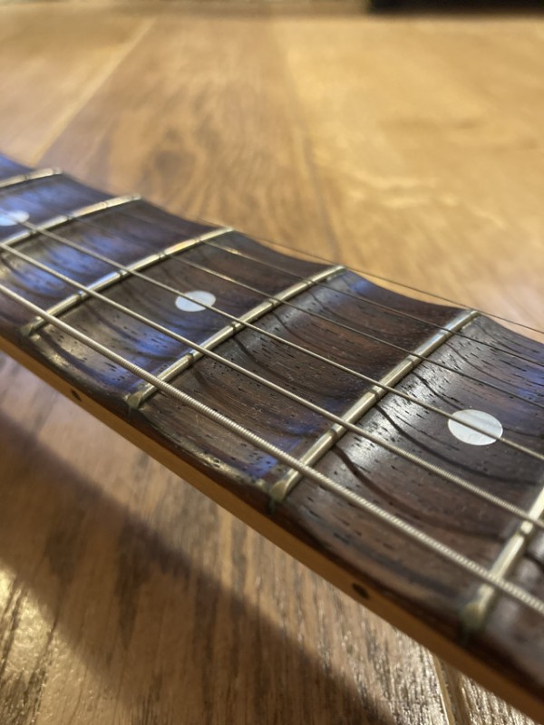 J'ai aussi refait le vernis du manche avec une finition satinée au tru-oil et à la cire, façon Music Man.