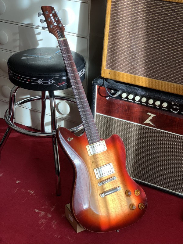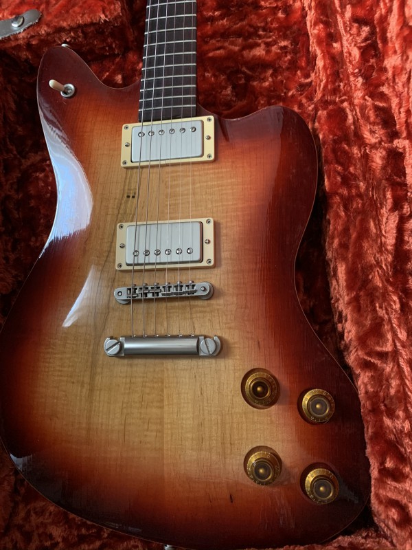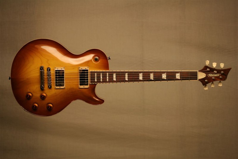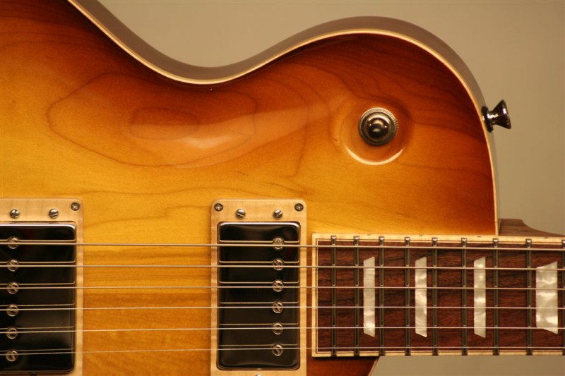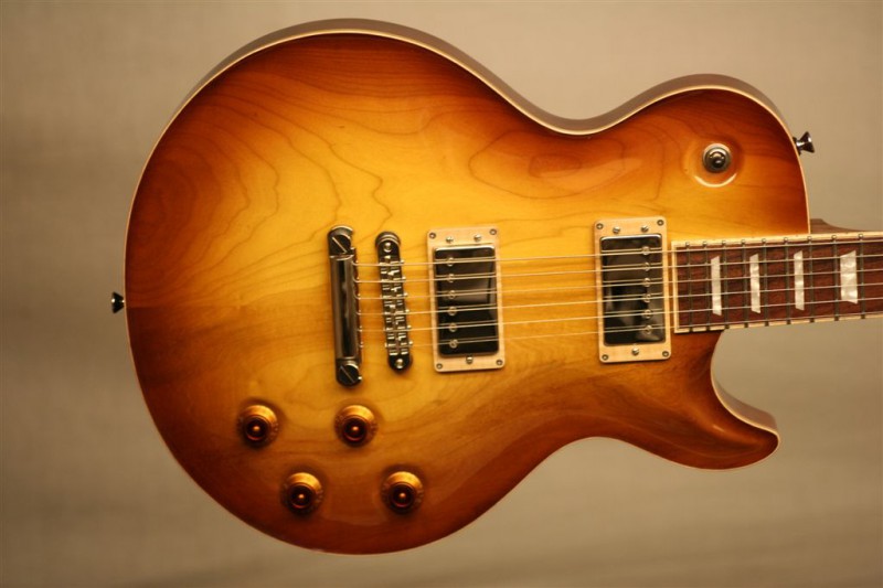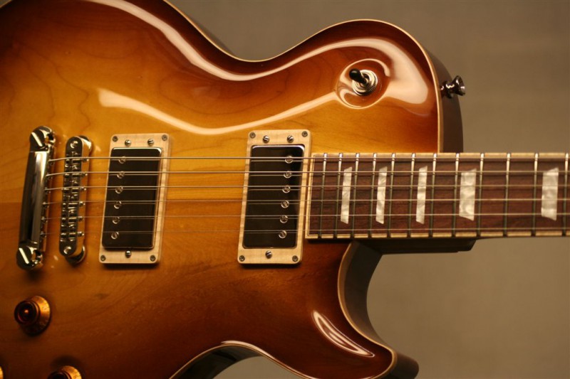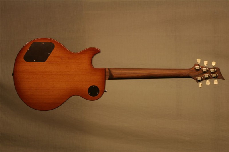 Body: Solid mahogany with plain maple top, tobacco burst in gloss finish .