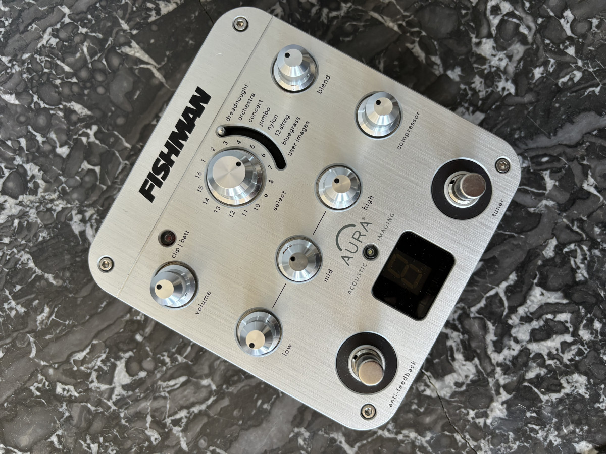 Ce préamp dispose d’un égalisateur 3 bandes, d’un bouton contrôlant le compresseur, d’une suppression automatique des larsens à 3 niveaux, d’un accordeur chromatique, d’une boucle d’effet et d’une DI haute qualité en XLR. Le logiciel inclus, la Aura Image Gallery, donne accès une grande liste d’instruments enregistrés à l’aide de micros studio.
