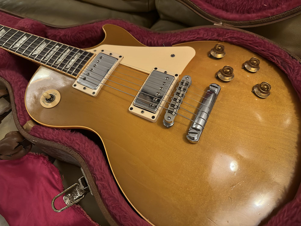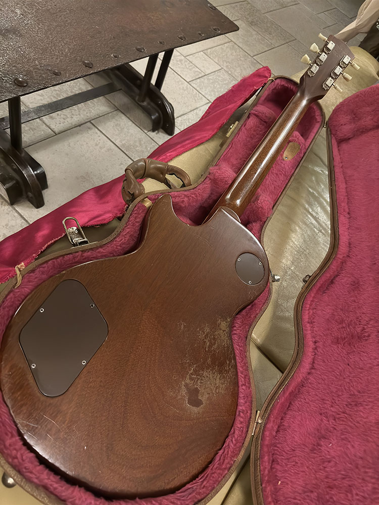 Tête fendue (non cassée mais début de la "maladie des Les Paul") réparée/recollée/revernie par luthier, jointure plus robuste qu'avant, légèrement visible sur une des photos, quasi aucune sensation de relief au toucher.