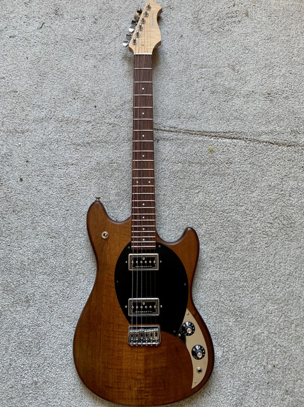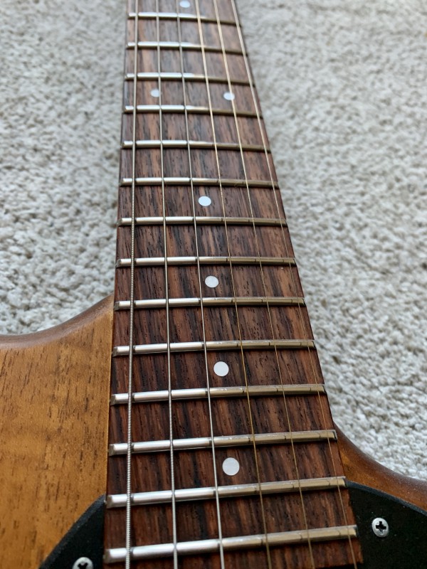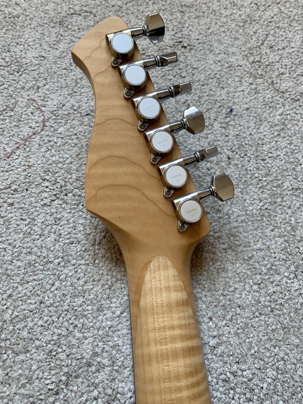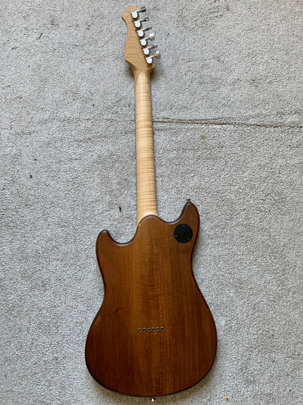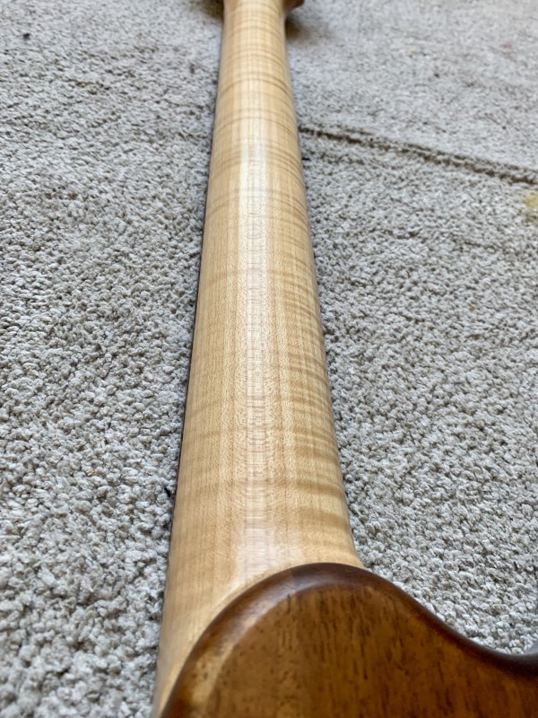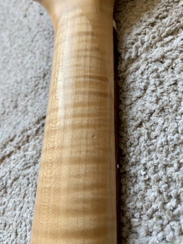 Le manche est en érable ondé de Roumanie, 22 frettes inox sur une touche en palissandre indien. Les repères sont en plastique blanc, sillet en os, mécaniques Gotoh de précision.
