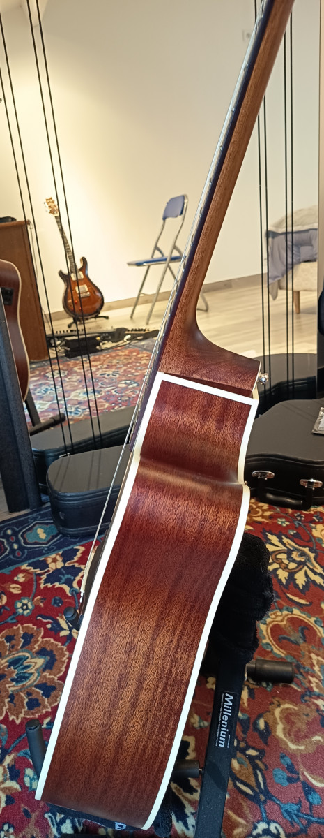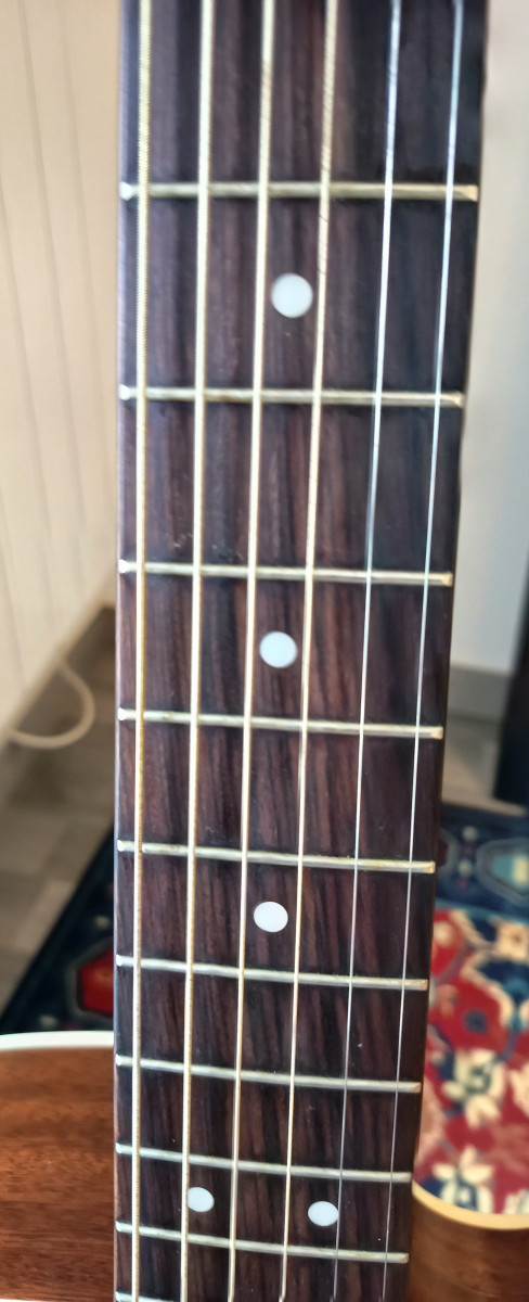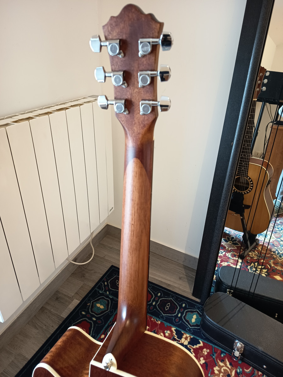 Elle a été réglée par un luthier, elle est facile a jouer action assez basse, pas de frise. Je donne avec 2 jeux de cordes neufs :Elixir 10/46 et D addario 10/46 ainsi que la clef pour régler le trussroad.