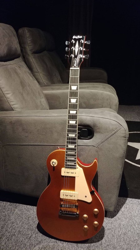 Electric' : FENDER Telecaster CIJ Reissue 62 "Olympic White", FENDER Stratocaster Player Series "Butter Cream", GRETSCH G2622T, GIBSON Les Paul Tribute 2019 "Honeyburst", GUILD S-200 P90, HB Esquire DIY, HB JA 60 « Shell pink »