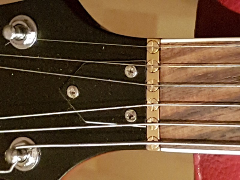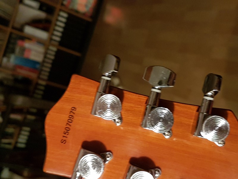 Je l'ai upgradée par des mécaniques à blocage, un chevalet à rouleaux, et un sillet de tête en laiton, à pontets réglables individuellement. Tenue d'accord parfaite, bon sustain.