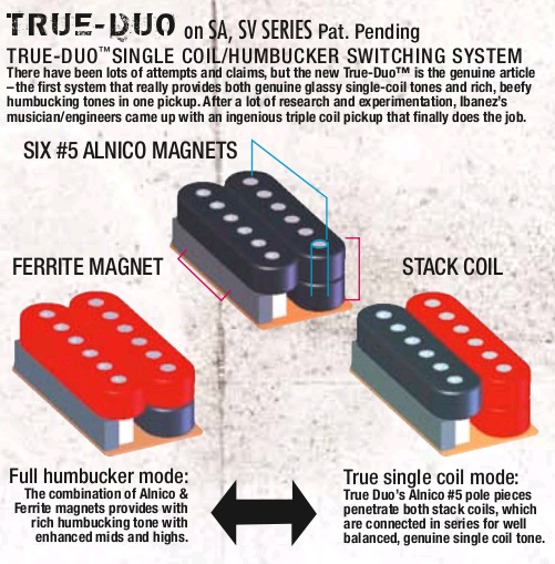 Je l'ai upgradée avec en tête l'idée d'en faire un instrument extrêmement polyvalent, en changeant ses micros par un set d'Ibanez True Duos, qui sont des micros assez spéciaux. Les humbuckers n'ont pas deux bobines mais 3 :