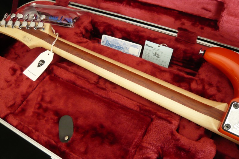 On est en présence d’une grande guitare autant à l’aise sur sons clairs que sons saturés et qui excellera dans le registre étendu Blues-Hard-Metal-Fusion évidemment ! La guitare est parfaitement réglée, cordes neuves ernie ball et livrée avec son etui (moumoute) Ibanez avec tous ses accessoires. Une fabuleuse machine à son, hyper facile à jouer !
