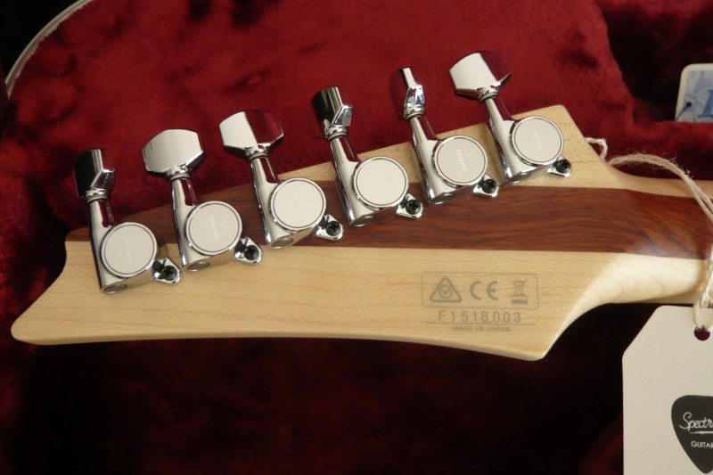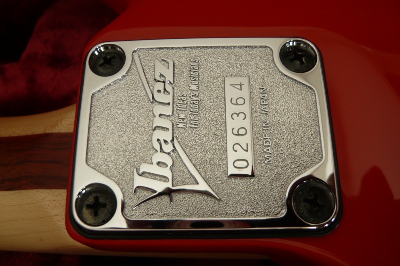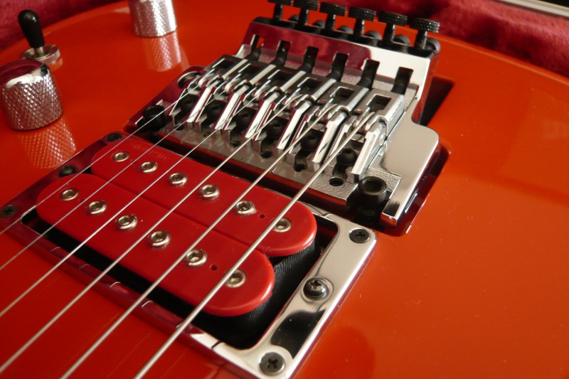Le niveau de lutherie-finition est de grade Custom shop et ses composants sont triés sur le volet : corps en aulne, manche vissé 3 pièces Erable-Bubinga 24 frettes W6105, vibrato double blocage Ibanez Edge (un régal de précision). Coté micros on trouve un impressionnant combo : Dimarzio Satch Track en format simple (manche) + Mo’Jo (chevalet) accompagnés par une électronique de précision : push/pull Coil-tap sur le contrôle de tonalité qui permet de n’utiliser qu’une des deux bobines du micro chevalet et push/pull Hi-pass filter sur le contrôle de volume (conserve le niveau de fréquences aigües lorsque l’on baisse le volume de la guitare.