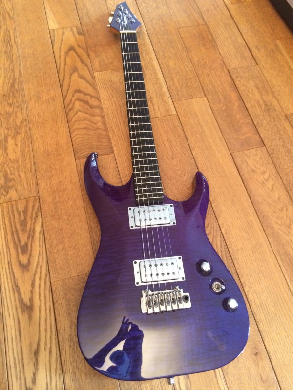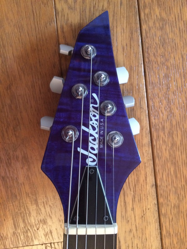 Modele rare de chez jackson. Couleur bleue/violacée. Fabriqué en 97, manche vissé erable, touche ebene, frettes en super etat, corps acajou + table erable flammée, 22f, 25,5'',,Vibrato Wilkinson, Mécaniques Sperzel a blocage. Super etat pour ses 21 ans, 2 /3 micro pocs rayures a peine visibles sur les photos mais franchement c'est pour pinailler ....