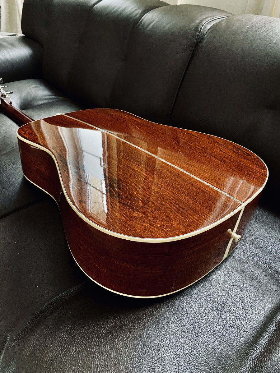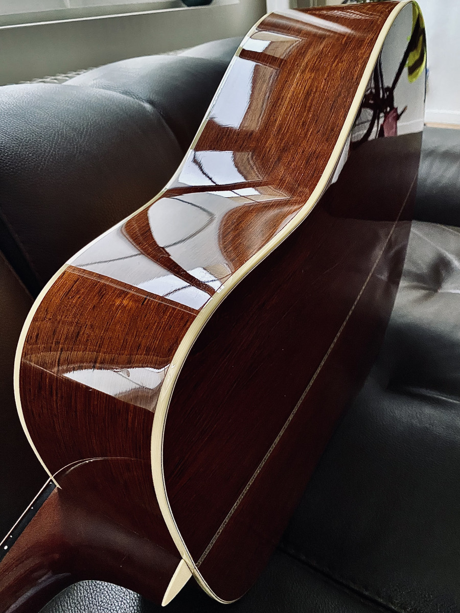 Dos et éclisses : palissandre de Madagascar rare et cher en option . Mon bois préféré , je le mets au dessus du Rio car un peu moins Bright et plus organique .
