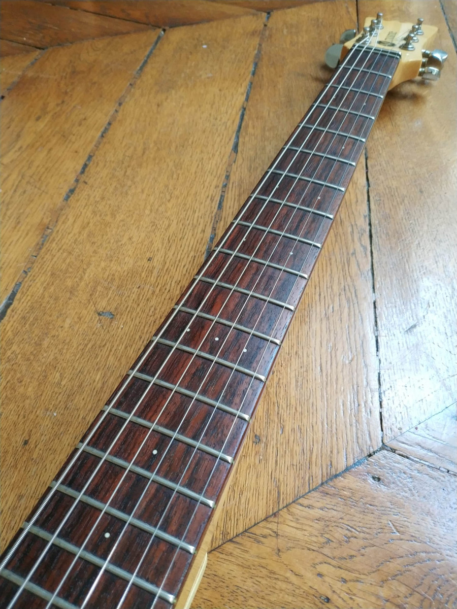 Manche vissé très fin (0.75" à la première frette et 1" à la 12eme frette) et rosewood. Finition poly.